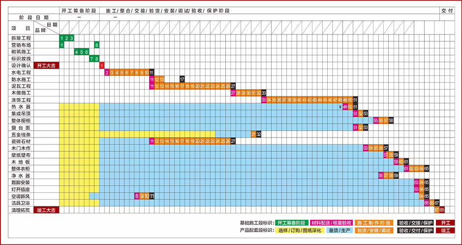 昌禾裝飾結(jié)合多年施工實踐,精心研發(fā)先進、穩(wěn)定、標準的魯班工藝施工體系,從開工籌備到竣工驗收,實行嚴格的節(jié)點控制,保證施工周期統(tǒng)一按標準推進,實現(xiàn)主材安裝的預排和分級管理,工序步步緊扣,全面確保家裝工程工期及質(zhì)量。